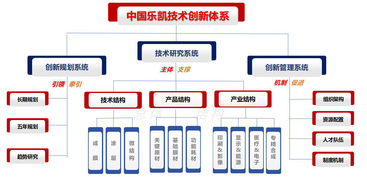 中國樂凱擁有以技術(shù)創(chuàng)新規(guī)劃系統(tǒng)為引領(lǐng)和牽引、以技術(shù)研究系統(tǒng)為主體支撐、以創(chuàng)新管理系統(tǒng)促進(jìn)體制機(jī)制優(yōu)化的完善、高效的技術(shù)創(chuàng)新體系。創(chuàng)新規(guī)劃系統(tǒng)主要發(fā)揮引領(lǐng)、牽引作用,把準(zhǔn)脈搏、認(rèn)清發(fā)展趨勢(shì),明確重點(diǎn)、謀劃創(chuàng)創(chuàng)新方向,為中國樂凱持續(xù)發(fā)展提供動(dòng)力和保障;技術(shù)研究系統(tǒng)主要是深入開展核心技術(shù)研究,進(jìn)行產(chǎn)品和關(guān)鍵原材料開發(fā)井實(shí)現(xiàn)產(chǎn)業(yè)化,支撐中國樂凱發(fā)展,是中國樂凱技術(shù)創(chuàng)新體系的主體和支撐;創(chuàng)新管理系統(tǒng)主要發(fā)揮體制機(jī)制促進(jìn)作用,監(jiān)控創(chuàng)新體系有效運(yùn)行,發(fā)揮支撐保障作用,推動(dòng)技術(shù)創(chuàng)新體系健康良性發(fā)展。